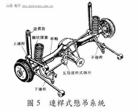 此型悬吊系统(Brandt, 1995)之标准型为四连杆型。连杆式悬吊系统系以四支连杆连接刚性车轴与车身,使车身定位,其上连杆呈八字形,而下连杆呈平行设置。各连杆需承受驱动力、制动力、纵向力及横向力。驱动力及制动力所造成之扭力及纵向力由上、下连杆共同承受;而横向力则由上连杆独自承受。避震器及弹簧仅具缓冲效果并无定位机能,如图5 所示。