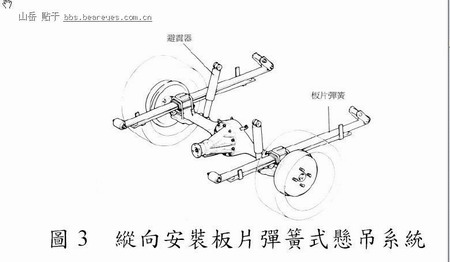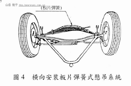 此型悬吊系统(Lahu, 1996)与纵向安装板片弹簧式之原理大同小异,其不同之处在於此型之板片弹簧与车轴呈平行设置,因此只需一付弹簧,然而,其缺点为水平方向的刚性较差,需加设悬吊臂以保持车轴之位置,如图4 所示。