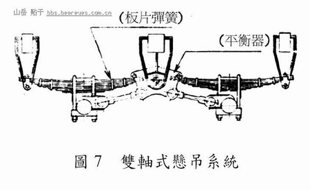 此型悬吊系统(Laidely, 1989)可视为纵向安装板片弹簧式的改良,将板片弹簧以串联的方式相接,采用二支车轴以减轻路面之压力及增加牵引力之悬吊方式,另设置平衡器以使二车轴之负载比率趋於一定值,如图7 所示。