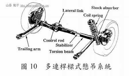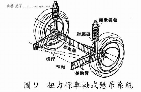 此型悬吊系统(Shimatani, 1999)系以一支扭力梁来连接左右车轮,该梁之二端设置拖曳臂与扭力梁成刚性配合,拖曳臂具有足够的刚性可抵抗纵向力,达成纵向定位;而扭力梁则用以调整车辆晃动之刚性;并利用横向杆以抵抗横向力与横向位移;并於扭力梁二端设置弹簧与避震器,以加强车辆乘坐之舒适性,但由於该型仅具拖曳臂前方二接点与车身结合,因此结合处的橡胶衬套之刚性格外重要,而其衬套常因受横向力作用而产生挠曲现象,因而导致悬吊系统失去平衡,如图9 所示。