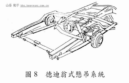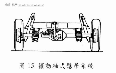 此型悬吊系统(赖耿阳,民87 年)早在二十世纪之前即已开发成功。此型悬吊系统系将後差速箱总成装置於横梁或车体上,由连结左右车轮之固定车轴悬吊之,如图8 所示。
