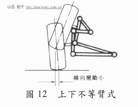 此型之下控制臂较上控制臂为长,如图12 所示。当车轮上下跳动造成控制臂作动时,仅产生极少量之侧滑,使轮距几乎保持不变,但却无法抑制车轮之偏转现象。