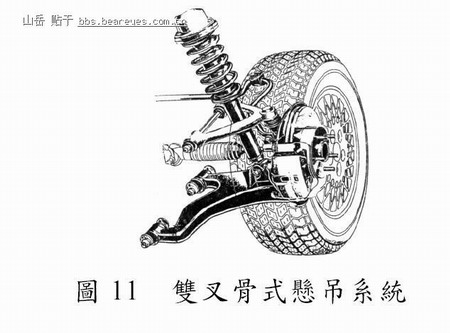 此型悬吊系统(Knowles, 1995)之特色在於具有上下控制臂,因控制臂呈Λ型故取其名,如图11 所示,控制臂的枢点位於车体或车架上,另一端以球型接头枢接於转向关节,而螺旋弹簧常置於上下控制臂之间,并与避震器组合使用;同时为减少车身滚动,而采用防倾杆以求车身安定。当车辆行驶遇路面不平时,控制臂之作动使车轮以接近垂直於地面的方向上下运动,故其乘坐舒适性良好,操控性亦相对提高。一种采取焊接方式将第一臂与第二臂(皆为轻薄金属板构件)相结合构成之下控制臂设计,可达到轻量化之目的,且整体构件之刚性并无受损,已发表於(Mukai, 1986)。一种可控制前展、零前展及前束之悬吊系统设计已发表於(Shibahata, 1988)。一种设置中间构件以置放弹簧之设计使弹簧连接於车架及上横导杆之间,以增加弹簧之最佳性能,已发表於(Schaible, 1989)中。为保持车辆受纵向力及横向力时前束之稳定性,而以前、後低杆取代下控制臂,且拖曳臂改以纵向设计,可增进乘坐之舒适性及操控之安全性(Lee,1994)。为修正外倾角曲线、改善胎面磨损以及增进转向性能,因而将大王销之上接点改为较上控制臂之接车身点为高之新设计已发表於( Butler,1999)。一种上控制臂短、下控制臂长之悬吊系统,可减少轮胎磨耗、增进操控性及舒适性,并减少外倾角变化量之设计,已发表於(Kuhn, 1998)。综上所述,此型悬吊系统已使用於较讲求舒适性的小客车,且已发展出数种改良型的双叉骨式悬吊系统,但皆符合此型悬吊系统之基本构型。