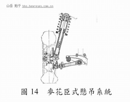 此型为现今悬吊系统的主流(Muhr, 1994),以支柱取代上控制臂,故可增大车内空间,如图14 所示。支柱总成上端以橡胶绝缘体固定於车身,下端与转向关节相连接,并设置张力杆以加强横向定位。一种可使用於支柱上的伸缩套筒型避震器已发表於(Pflughaupt, 1981)。此外,针对悬吊臂进行改良,以使悬吊臂之内部应力均一,可增强悬吊臂之耐久性(Takeuchi, 1994)。与其他独立悬吊系统相较,此型具有构造简单、成本低廉、性能良好以及占用较少空间之优点,其缺点则为支柱轴、轮胎触地点及支柱上安装点三者不共线,导致支柱上产生弯矩,故需使支柱轴与螺旋弹簧偏置或在支柱内使用低摩擦衬套,以克服弯矩所造成之负面影响。