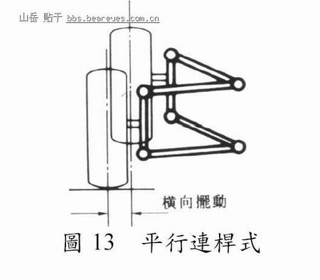 此型之上下控制臂互相平行且长度相等,如图13 所示。当车轮上下跳动时,外倾角不会改变,因此车轮不会产生偏转现象,但是却会产生明显的侧滑现象,造成左右轮距改变,轮胎易於磨损。