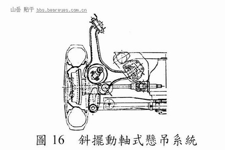 此型悬吊系统(Lahu, 1996)系藉驱动轴及控制臂以悬吊车轮,该驱动轴自差速器延伸至左右车轮,其功能除了传输扭矩之外,亦需支撑车重,并抵抗制动时的反作用力,故轮轴需有足够强度。另於车轴上设置避震器及螺旋弹簧,以增加乘坐舒适性。当车轮上下振动时,摆动轴以万向接头为中心作圆弧形摆动,易产生侧向滑动,加速轮胎磨损。又因其外倾角的变化,以致於造成转向不足或转向过度的问题,不利於车辆之操控性。为改善此一缺点,可适度增长驱动轴之长度或降低万向接头之位置,如图15 所示。而另一种控制臂之枢轴与驱动轴内侧接头在同一线上者属斜摆动轴式,如图16所示。