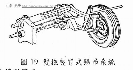 此型悬吊系统(Lahu, 1996)系以二支呈上下平行之拖曳臂加强车轮之纵向及横向定位,其余构型与全拖曳臂式悬吊系统完全一致,现今多应用於高承载之车辆,如图19 所示。