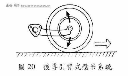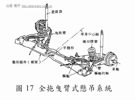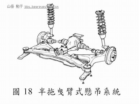 此型悬吊系统(Lahu, 1996)之特色在於拖曳臂之枢轴与轮轴相互平行,而该拖曳臂藉枢轴与车身相连接,如图17 所示。当车轮上下振动时,经由拖曳臂将振动之能量传递至弹簧,并由弹簧吸收之,以避免影响车轮之纵向及横向定位。此型悬吊系统之优点为占用空间较少,可使车内空间加大,适用於小型车辆。