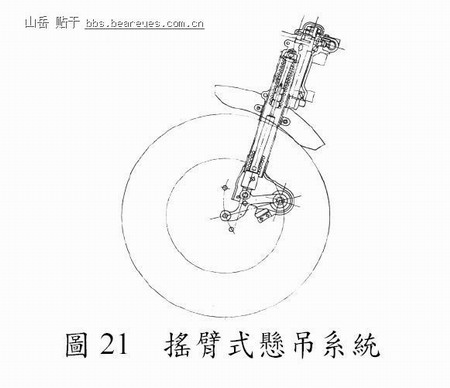 此型悬吊系统(中国国家标准(CNS),汽车悬吊装置名词),如图21 所示,系采用摇臂机构以限制车轮之振动范围,并以螺旋弹簧缓和车轮之震汤。该摇臂机构因承受极大之应力,所以需有较高之强度。此型悬吊系统之优点在於占用空间较小。该摇臂机构结合空气弹簧及板片弹簧之应用已发表於(Raidel, 1988)。
