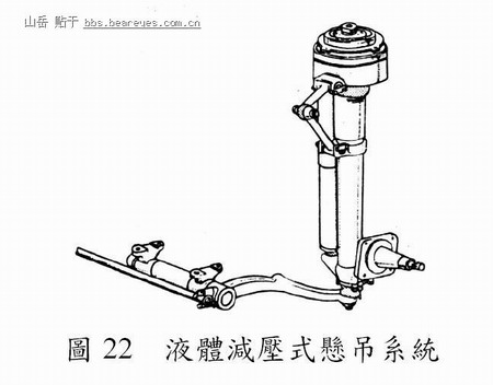 此型悬吊系统(Palitto, 1982)系於大王销(kingpin)上安装液体弹簧。车辆之转向扭力可经由大王销传递至弹簧及避震器,使车身保持平衡,如图22 所示。
