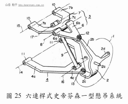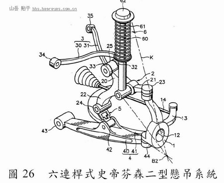 此型悬吊系统(Lee, 1994)之基本构造有别於史帝芬森一型之处在於:其下控制臂与接合臂(connecting arm)为三元杆,车身、上控制臂、转向关节与中心臂(central arm)为二元杆,如图26 所示。此型悬吊系统之优点在於:其连杆配置之独特性,使得外倾角之变化量得以控制於最小之范围内,可改善车辆之直进性,并减少轮胎之磨耗(Lee,1997);当车辆转向时可使外侧车轮之外倾角保持负值,以增加轮胎之抓地力,使车辆转向更加平稳(Lee, 1994);当车轮上下振动时车辆之滚动中心(roll center)的高度变化量较小,使得操控稳定性增加(Lee, 1997)。其改良型(Lee, 1995)虽增加一短杆,但基本架构仍为史帝芬森二型。