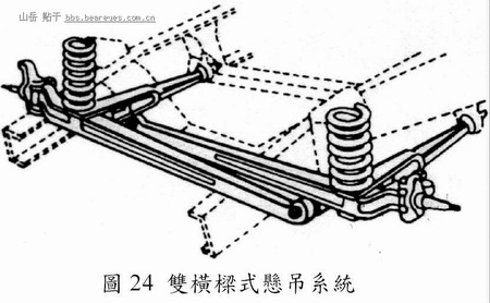 此型悬吊系统(Knowles, 1995)之特色在於具有二支横梁(I-beam),分别用以支撑左右前轮,任一横梁之一端经由具橡胶成分之枢轴连接於车架,另一端则连接於轮轴,如图24 所示,而螺旋弹簧置於横梁活动端与车架之间,另以半径臂纵向连接车架与横梁活动端,以防止车轮之纵向移动。当车轮上下振动时,横梁之活动端上下移动因而压缩或伸展弹簧。由於此型悬吊系统可承载较大之重量,故多半用於小卡车。