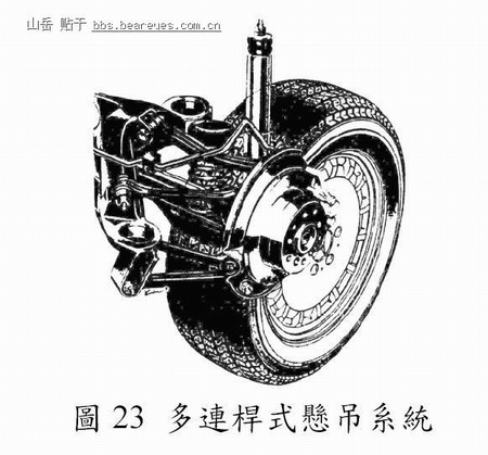 此型悬吊系统(Reimpell; Stoll, 1996)具有较大的几何变化与设计自由度,其系以数支连杆达成车轮之纵向与横向定位,与双叉骨式悬吊系统相似,可视为双叉骨式的改良型,如图23 所示。与其他型式之悬吊系统相比较,多连杆式悬吊系统可减少车轮外倾角及车辆滚动中心(roll center)高度的变化,有助於稳定方向与控制转向,可提升车辆的直进性、减少胎面磨损与车辆转向之顶起现象,属於一种较先进之悬吊系统,然而其零件较为复杂且更精密,以致於整个悬吊系统之重量、体积及成本均会增加。