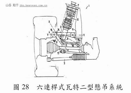 此型悬吊系统(Luger, 1991)之基本构造主要系由两支三元杆与四支二元杆所构成,即一上控制臂与底盘为三元杆而一下控制臂、转向关节、压力杆与控制杆为二元杆所组成,如图28 所示。此型悬吊系统之优点在於:因避震器枢接於压力杆与控制杆的接点上,使得因路面凹凸不平所导致悬吊系统上下跳动之力量,传递至避震器时可充分由避震器所吸收,以大幅增加避震器之减震功能。