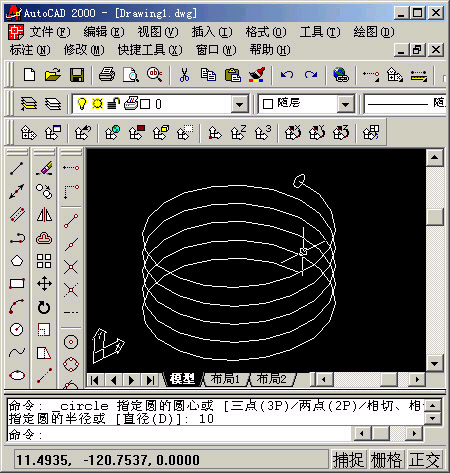 4、输入命令helix 注意,这个命令是第一行Defun C:后面的那个单词,不是加载的文件名 根据提示输入尺寸获得立体螺旋线,然后把坐标竖起来画一个圆