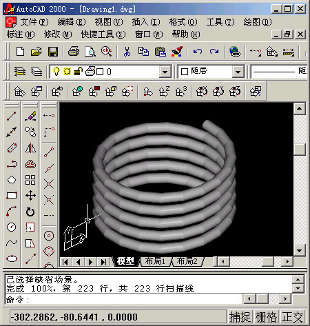 请注意:我们可以看到这个弹簧不光滑,说明在输入数据时要增加段数,不能把多段线转化为样条线,因为数学模型是不正确的,这是我不久前从陈老师那儿学到的
